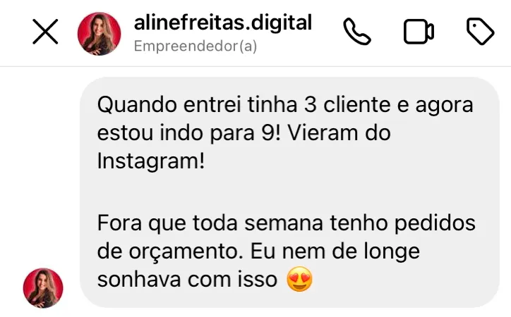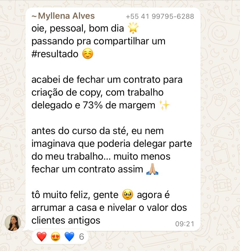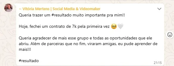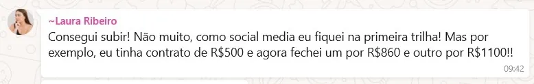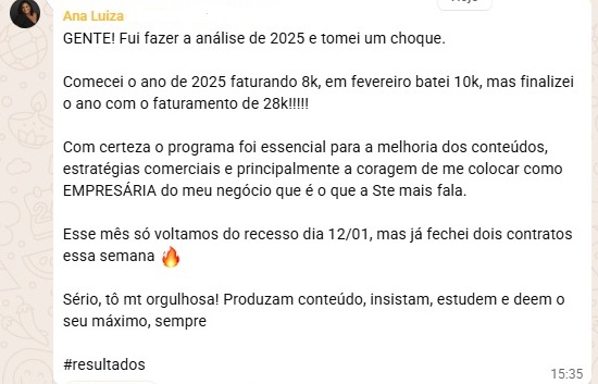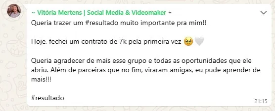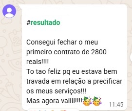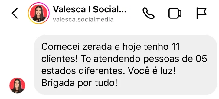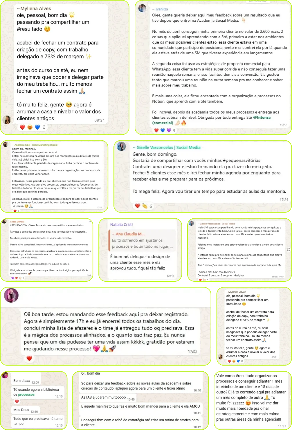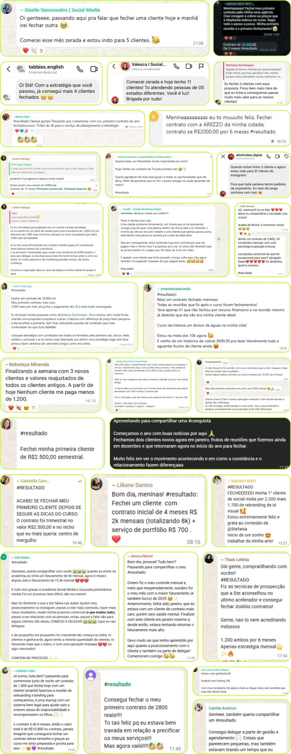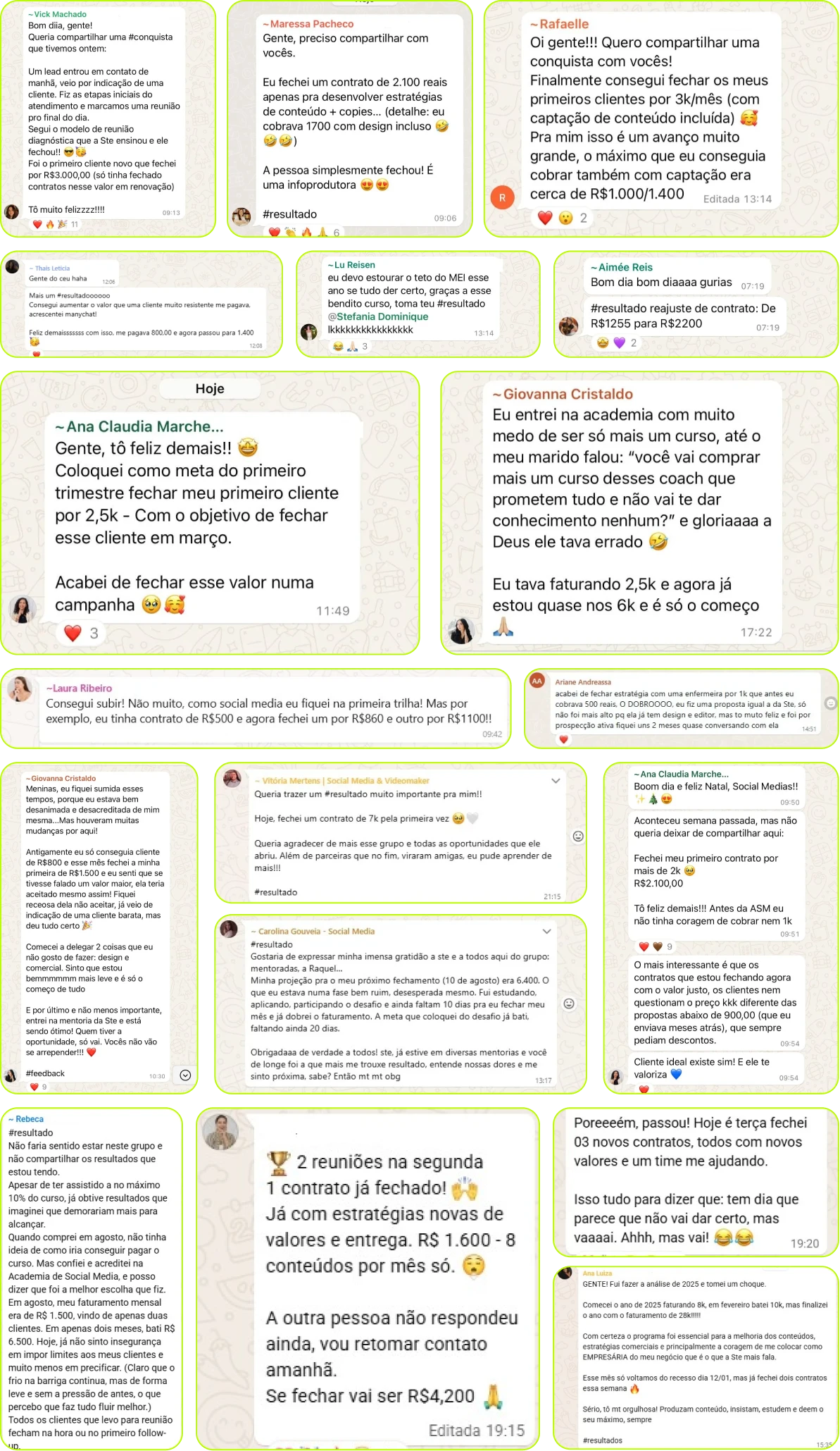 Veja com seus próprios olhos o que acontece com quem aplica o que aprende aqui. Social medias que cobravam R$500 e hoje cobram R$2.000. Gente que saiu do caos pra uma rotina organizada. Alunas que nunca tinham fechado um contrato… e hoje vivem disso.