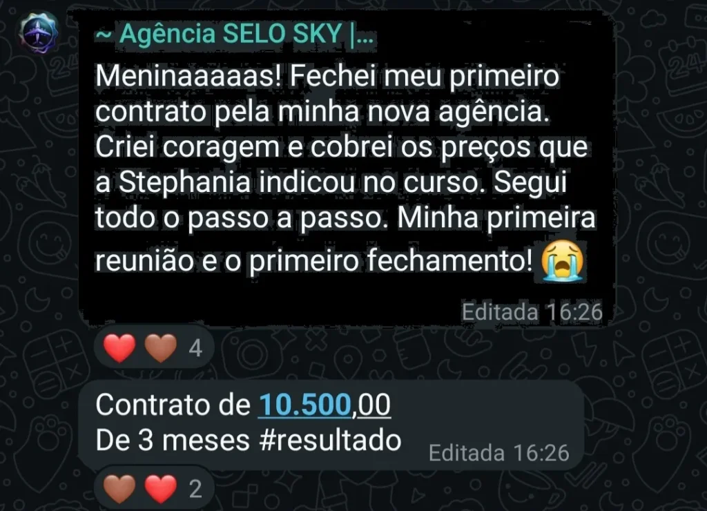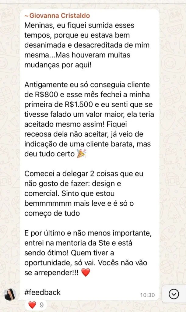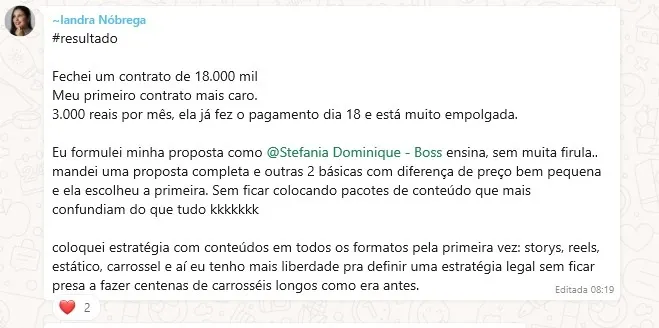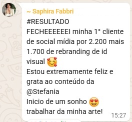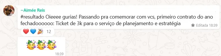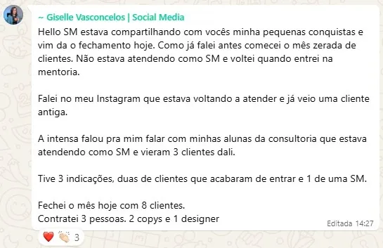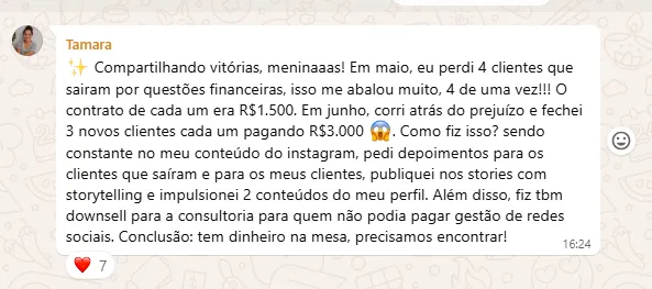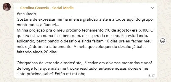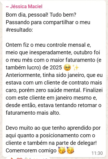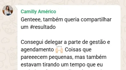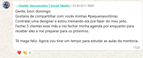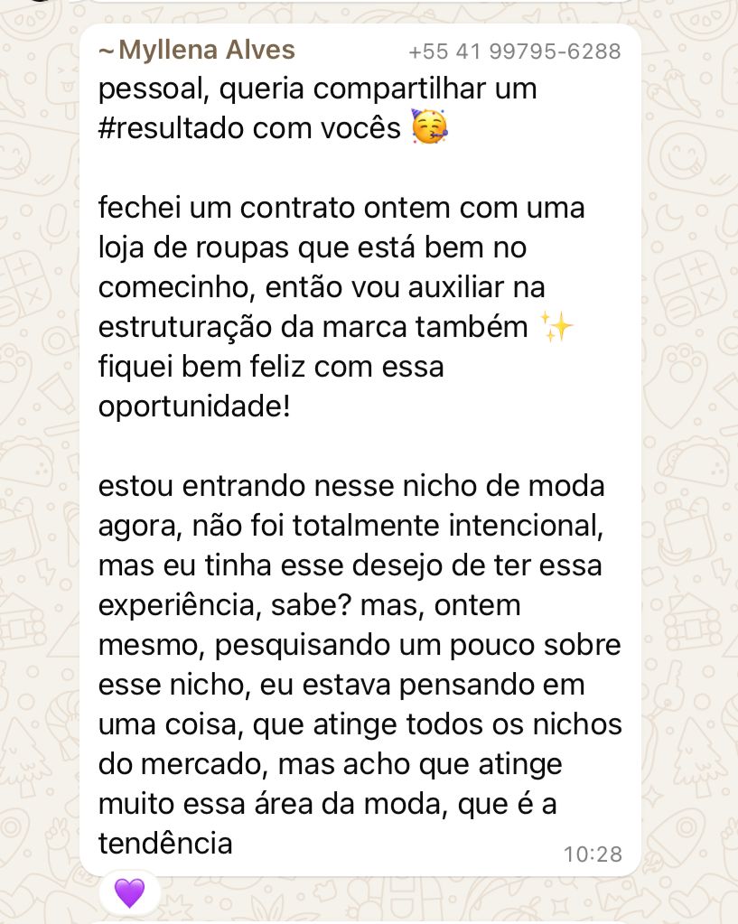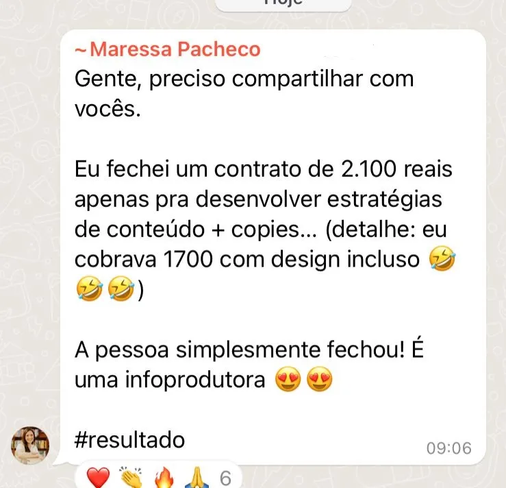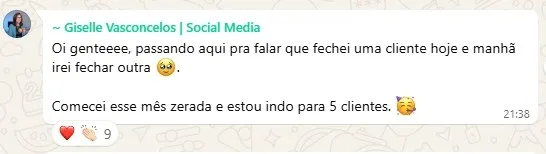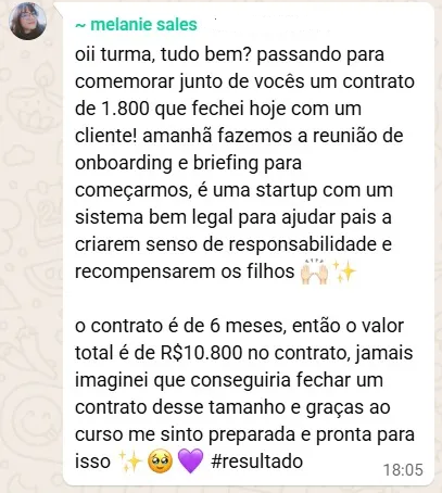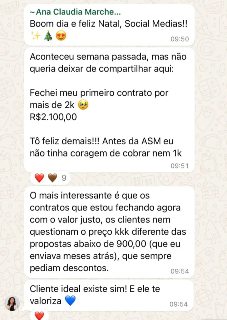 Veja com seus próprios olhos o que acontece com quem aplica o que aprende aqui. Social medias que cobravam R$500 e hoje cobram R$2.000. Gente que saiu do caos pra uma rotina organizada. Alunas que nunca tinham fechado um contrato… e hoje vivem disso.
