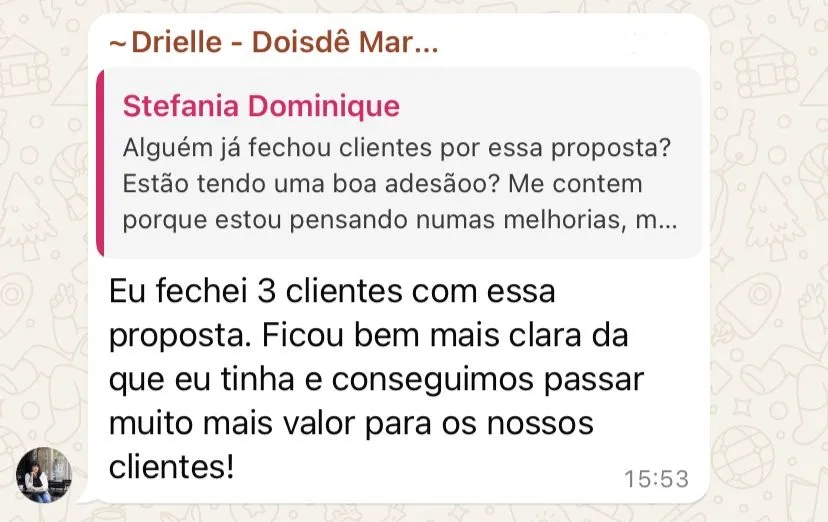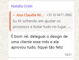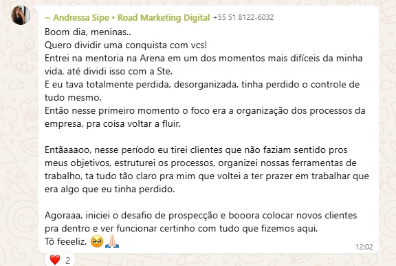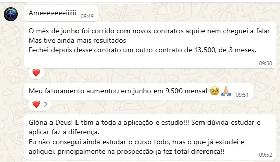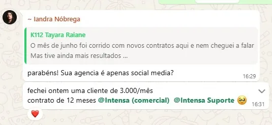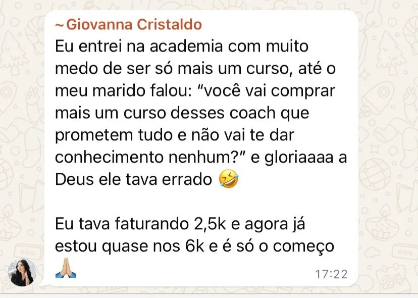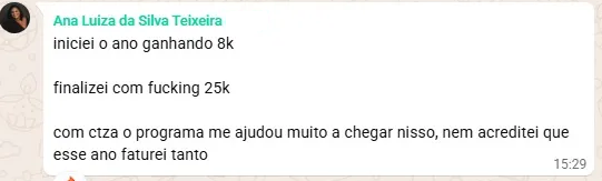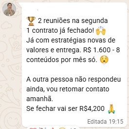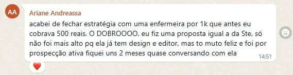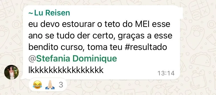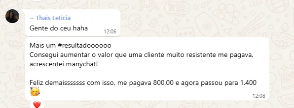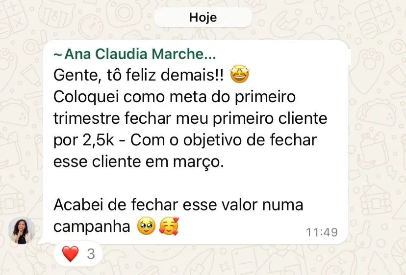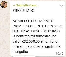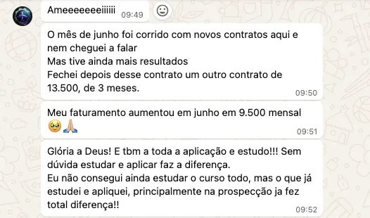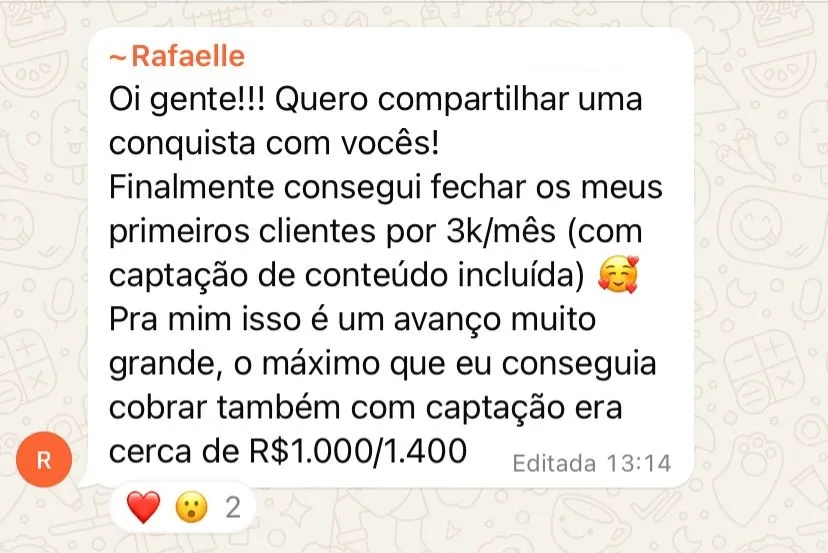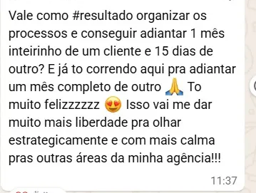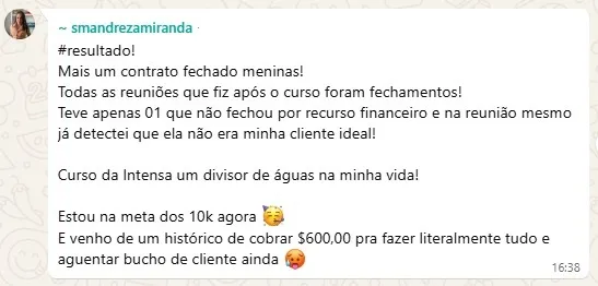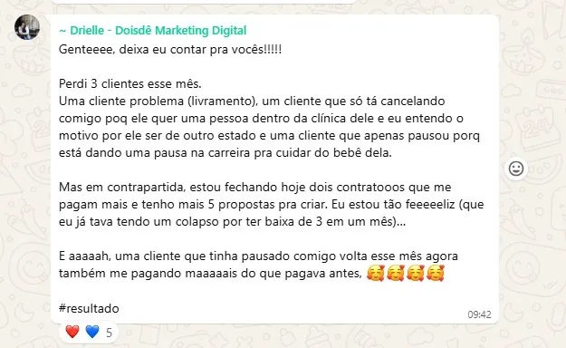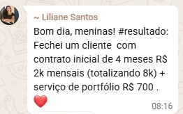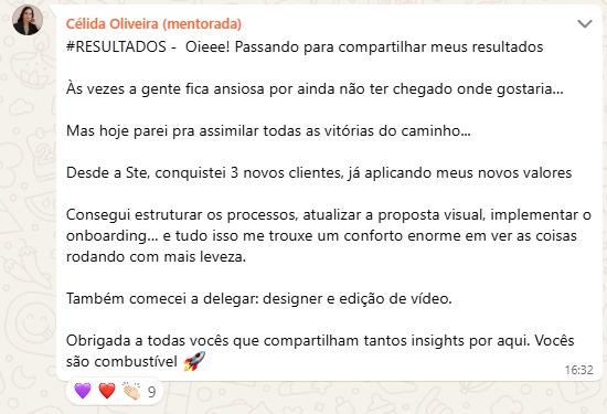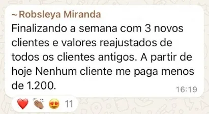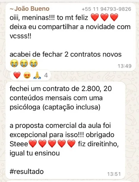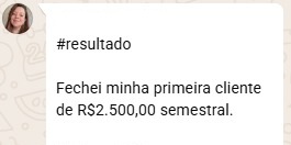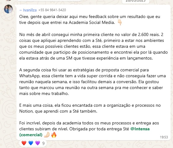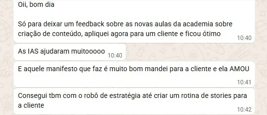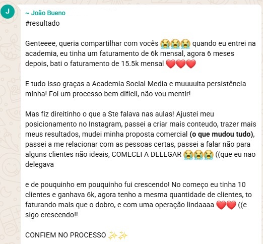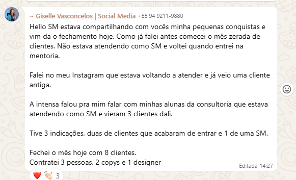 Veja com seus próprios olhos o que acontece com quem aplica o que aprende aqui. Social medias que cobravam R$500 e hoje cobram R$2.000. Gente que saiu do caos pra uma rotina organizada. Alunas que nunca tinham fechado um contrato… e hoje vivem disso.